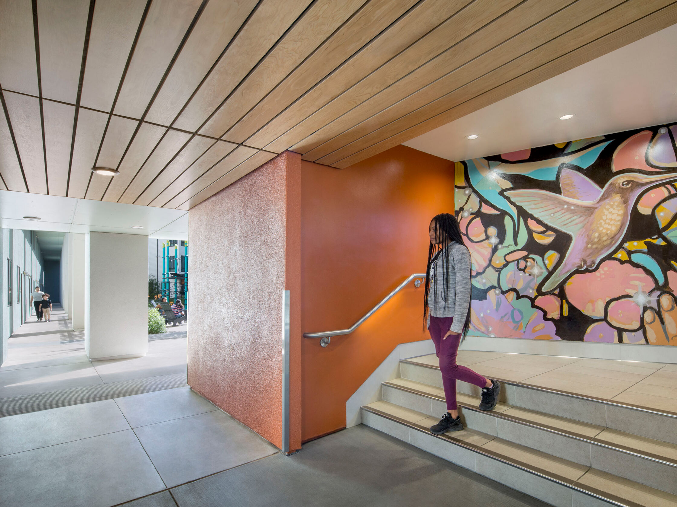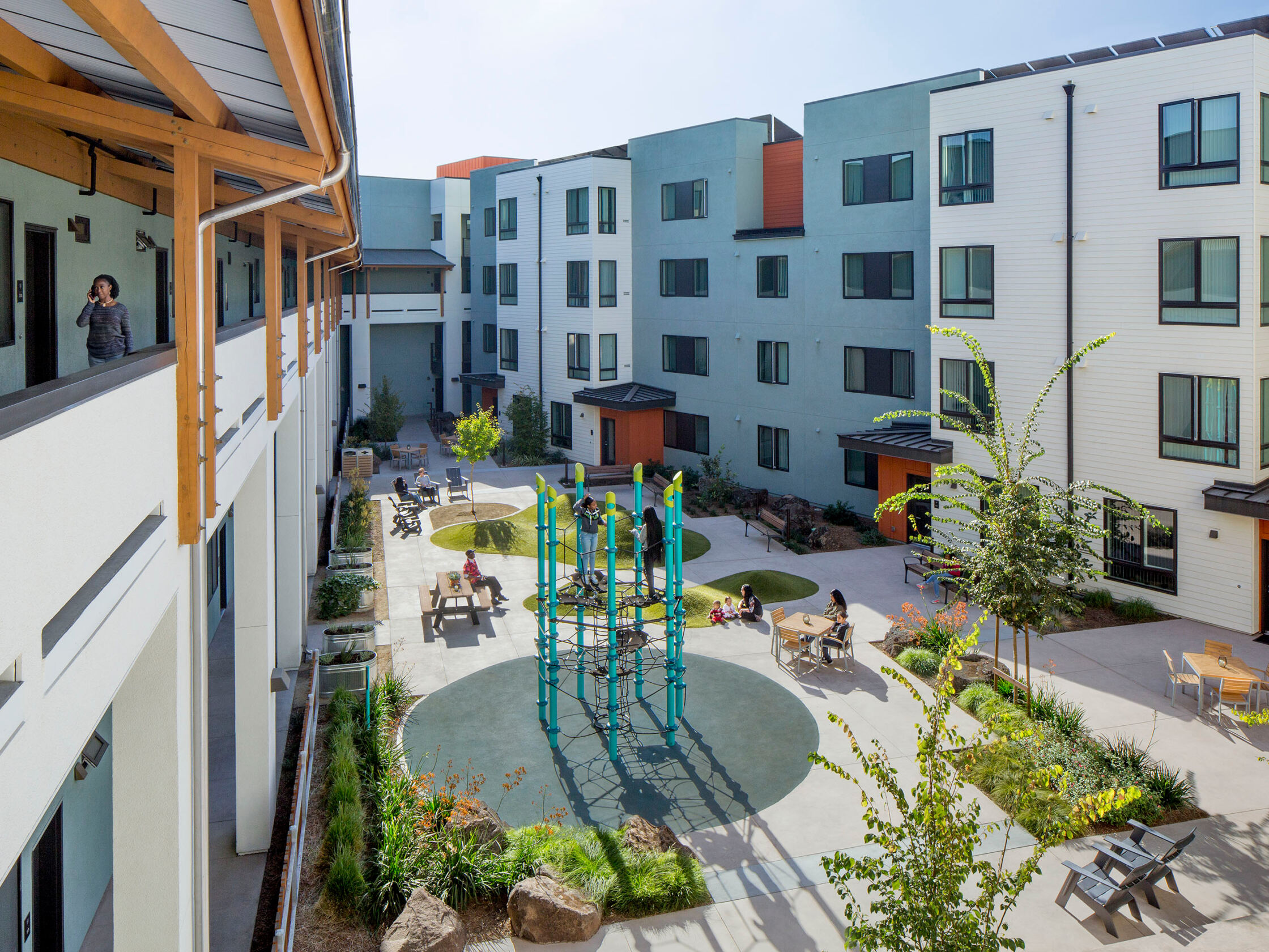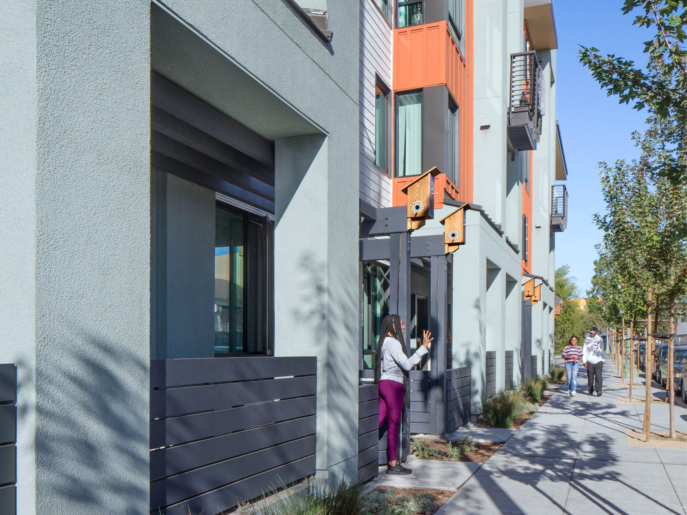 A mix of townhomes and flats are arranged around three courtyards to create a simultaneously outward- and inward-facing community. The courtyards and open-air walkways ensure residents have access to through-ventilation and shared outdoor space while reducing overall energy demand. The townhomes along East 12th Street include front stoops and balconies, while apartments along the BART tracks are equipped with sound-insulating windows. A pedestrian path on the BART frontage connects neighbors with Fruitvale Station, and a paseo anticipates an adjacent development that will complete the Transit Village. A ground floor community room positioned between the main courtyard and paseo joins other resident amenities including a computer lab, bike room, parking garage, laundry, package lockers, and offices for supportive services.