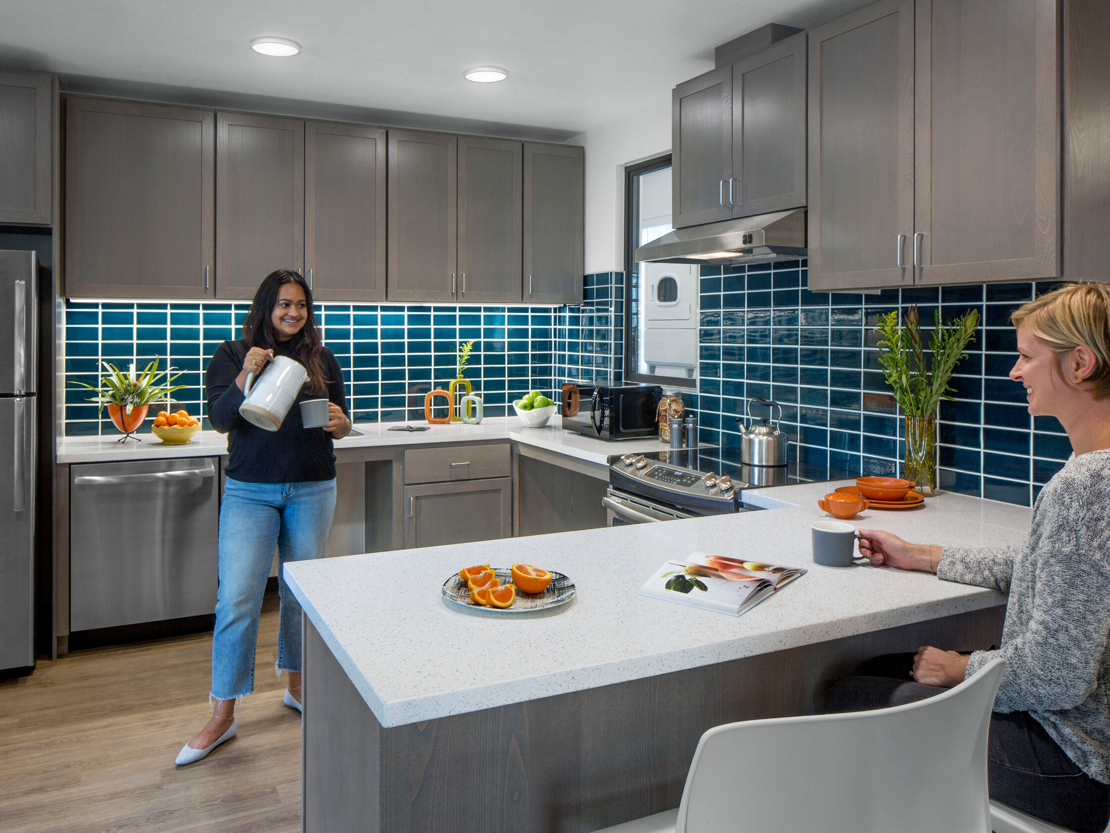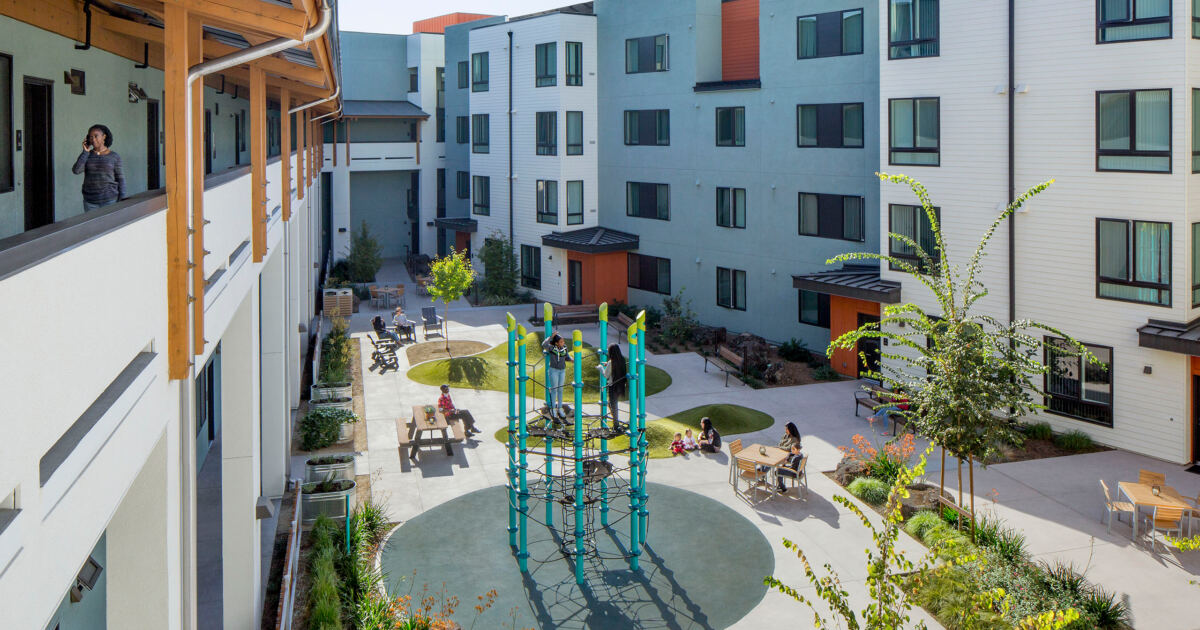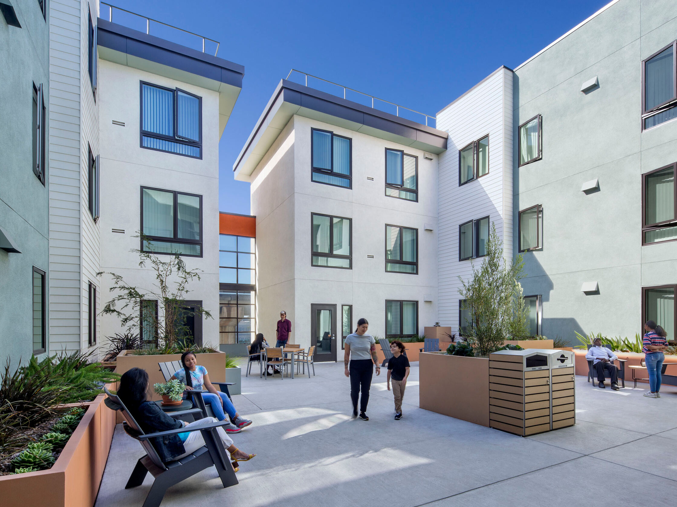 A mix of townhomes and flats are arranged around three courtyards to create a simultaneously outward- and inward-facing community. The courtyards and open-air walkways ensure residents have access to through-ventilation and shared outdoor space while reducing overall energy demand. The townhomes along East 12th Street include front stoops and balconies, while apartments along the BART tracks are equipped with sound-insulating windows. A pedestrian path on the BART frontage connects neighbors with Fruitvale Station, and a paseo anticipates an adjacent development that will complete the Transit Village. A ground floor community room positioned between the main courtyard and paseo joins other resident amenities including a computer lab, bike room, parking garage, laundry, package lockers, and offices for supportive services.