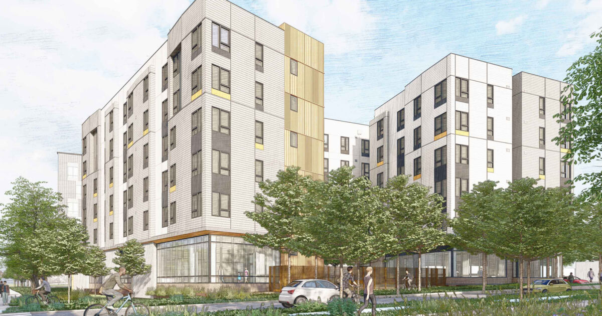 The six-story building is located immediately adjacent not only to the BART station and elevated rail line but to the Ohlone Greenway pedestrian trail and the intersection of Central Avenue and Richmond Street. Parcel A-South is formatted for modular construction and will include 70 1-, 2-, and 3-bedroom apartments above a ground level podium. Podium amenities include a residential lobby, community room, manager and service provider offices, mail and parcel rooms, laundry, and vehicular and bike parking.