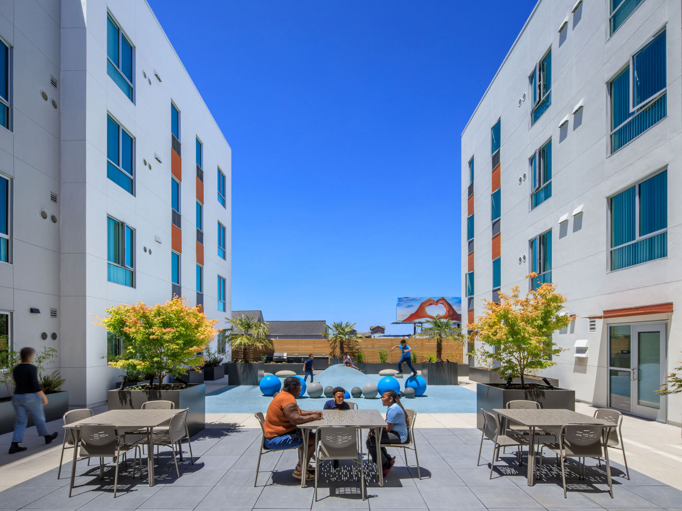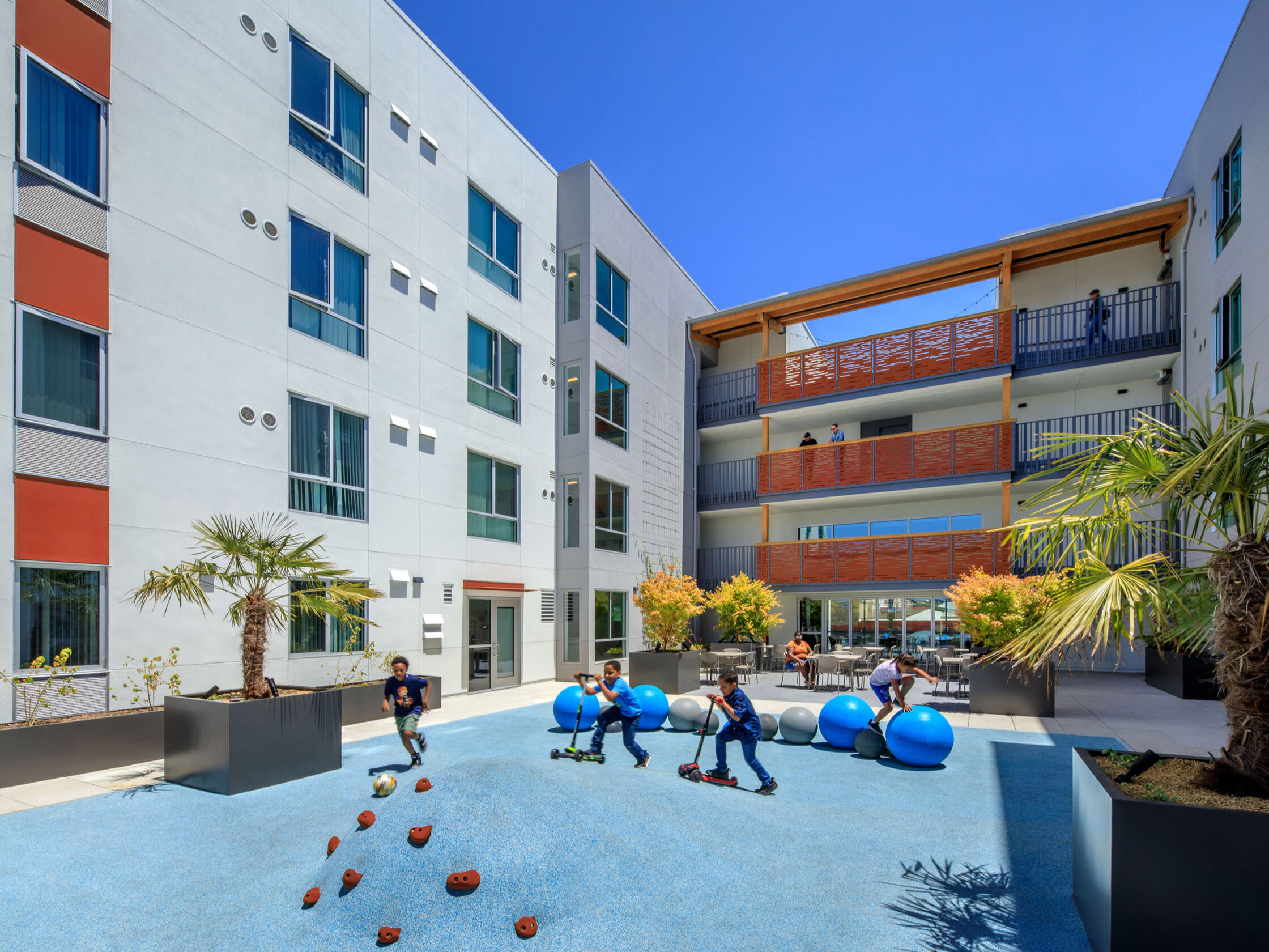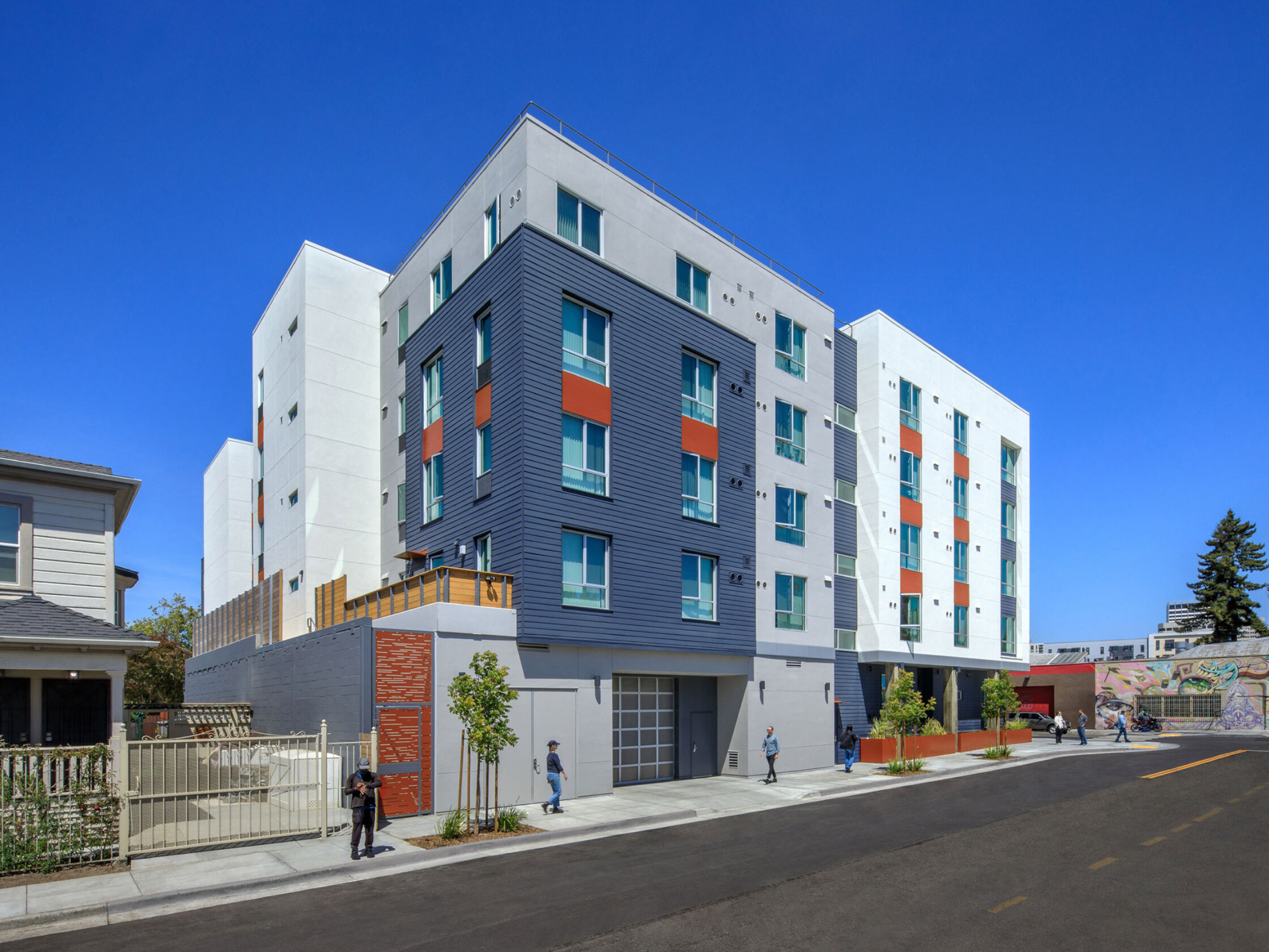 Five stories of apartments partially enclose a 3,300-square-foot, all-ages podium-level courtyard. The play area and seating patio are adjoined by a double-height, kitchen-equipped community room and a laundry room. Second-floor community room and services offices join a ground floor flex space, resident lobby, and 1,200-square-foot commercial space in activating the intersection of West Grand Ave with Brush St, strengthening the urban fabric.