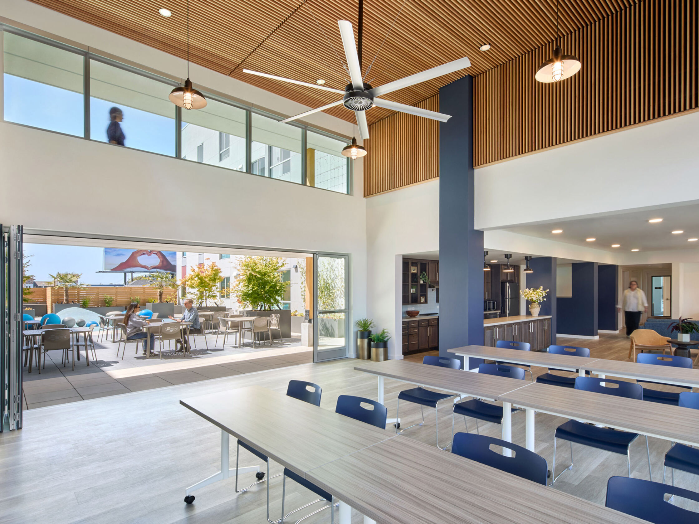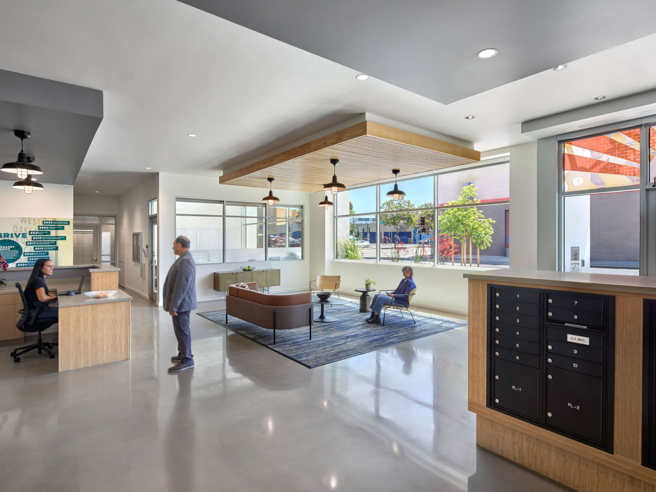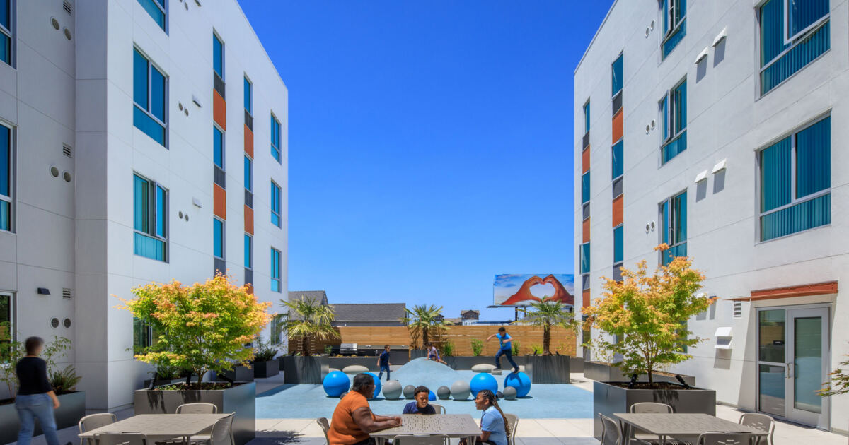 Five stories of apartments partially enclose a 3,300-square-foot, all-ages podium-level courtyard. The play area and seating patio are adjoined by a double-height, kitchen-equipped community room and a laundry room. Second-floor community room and services offices join a ground floor flex space, resident lobby, and 1,200-square-foot commercial space in activating the intersection of West Grand Ave with Brush St, strengthening the urban fabric.